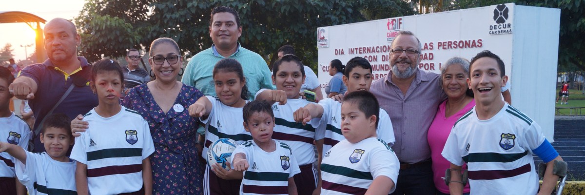 Cárdenas, Tabasco. En la Unidad deportiva “Domingo Colín” se realizó un cuadrangular deportivo de futbol soccer, en la que estuvo como invitada especial la Sra. Rosa Margarita Cuevas Castro, Presidenta del voluntariado DIF municipal, celebrando con los niños de futbol down de la escuela de inclusión “Cañeros de Cárdenas” que dirige Benito Picazzo Madrigal << El Día Internacional de las Personas con Discapacidad>> dando a la inclusión una forma social que favorece significativamente la participación humana en todos sus ámbitos.
