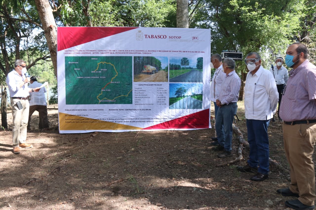 Poco antes, el Gobernador visitó la ranchería Bitzal segunda sección, donde inauguró la reconstrucción de pavimento asfáltico y revestimiento de grava de 21 kilómetros del camino Lázaro Cárdenas-Bitzales, trabajos en los que se ejercieron más de 15.2 millones de pesos y que benefician a más de mil 500 habitantes de la región.