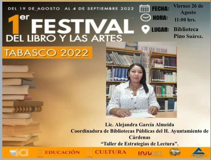 Cárdenas, Tabasco. La Dirección de Educación cultura y recreación que dirige JesúsAlbertoAquino Mayorga, te invita este viernes 26 de Agosto, en punto de las 11:00 am al 1er Festival del Libro y las Artes en Tabasco 2022, en la Biblioteca Pino Suárez.